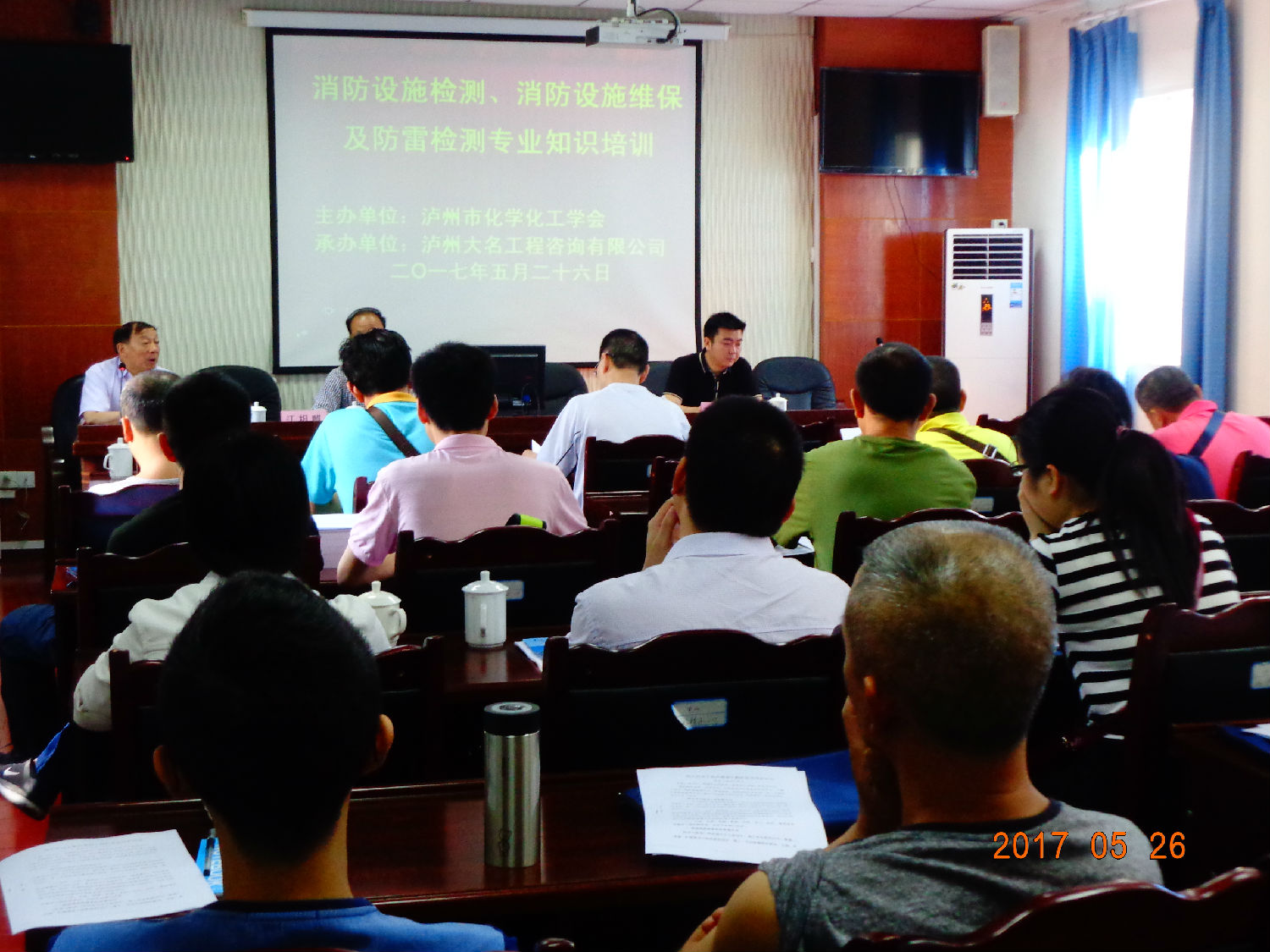 2017年5月26日上午九点,由泸州市化学化工学会主办,泸州大名工程咨询有限公司承办,对来自四川众邦制药有限公司、泸州华润兴泸燃气有限公司、西南医科大学附属中医医院、泸州富邦化工有限公司、四川凯达化工有限公司、泸州大洲化工有限公司、西南医科大学药学院、四川新火炬化工有限公司、中国航天科技集团公司川南机械厂、泸州长江液压密封件有限公司、泸州大名工程咨询有限公司等13个企(事)业单位的45名经理、主任、安全技术人员、消防管理人员、生产设备主管,工段长等进行了“消防设施检测、消防设施维保及防雷设施检测专业知识”宣讲培训。进一步加强了相关法律法规的学习,普及了消防安全、防雷减灾科普专业知识,以及“消防设施检测、消防设施维保和防雷专业检测操作实务等。